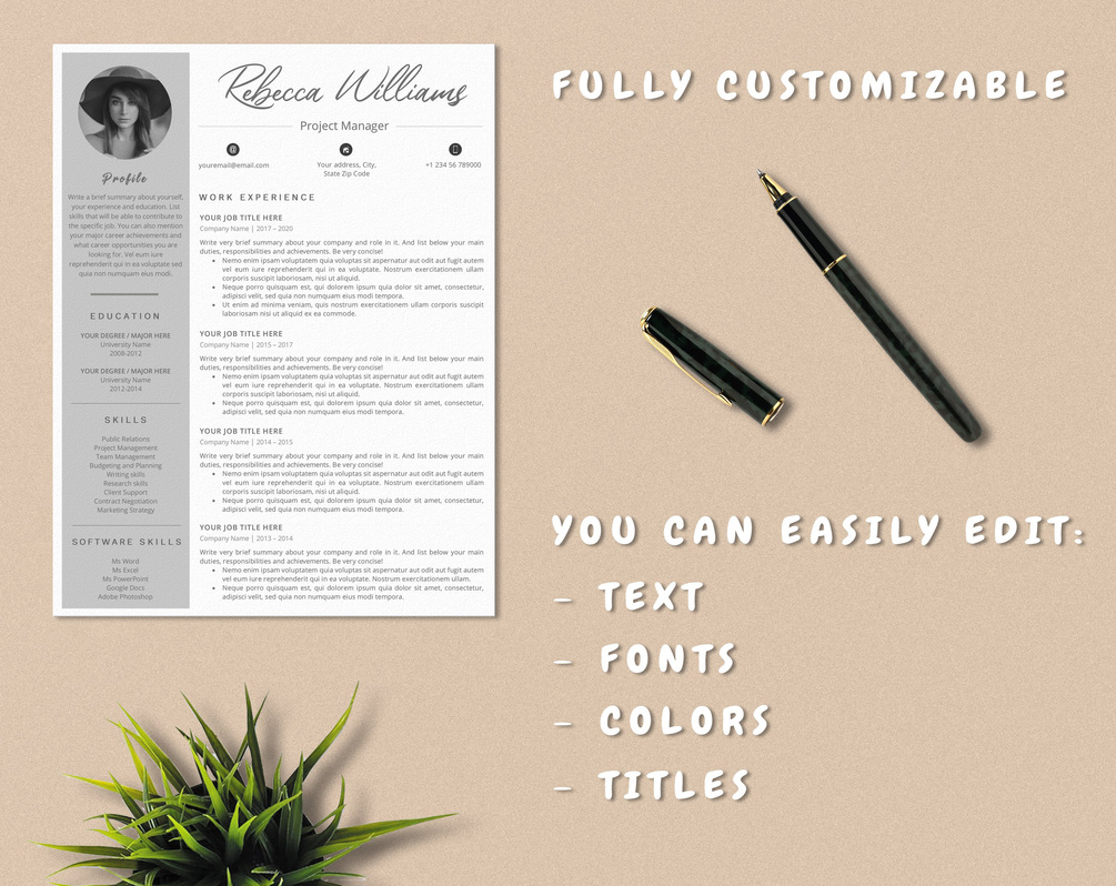 This template is easy to customize. You can duplicate anything, move units or delete anything you do not need. You can also change colors and fonts and make your resume unique.